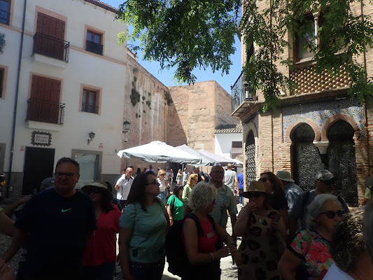 La subida va terminado, comenzando a llanear en las inmediaciones de las alineadas casas, blanquísimas y adornadas profusamente de macetas en la Placeta de las Minas, que desemboca junto a la imponente muralla protectora que atravesamos por la Puerta de las Pesas para disfrutar de Plaza Larga, probablemente una de las más castizas del Albaicín, en donde late con fuerza el corazón del barrio, plena de gente bulliciosa, tiendas, bares, restaurantes, etc... y destacando, para mí, la querida cafetería Pasteles, sitio en el que la Madre, si nos habíamos portado bien, nos compraba helados, pasteles y otros dulces. ¡Uuuumm, qué momento delicia!